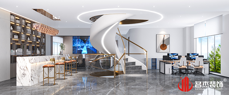 考慮到企業是以銷售為主,簡約的風格是可以讓辦公室裝修設計空間看起來更加干練,同時沒有過多的裝飾,讓空間變得更加有效率。在展廳區域采用科技感強烈的元素,讓空間充滿未來感。而在休閑區則是使用簡約而不簡單的元素,加上燈帶的烘托下,舒適休閑的感覺油然而生,可以讓員工緊張的情緒得到放松。