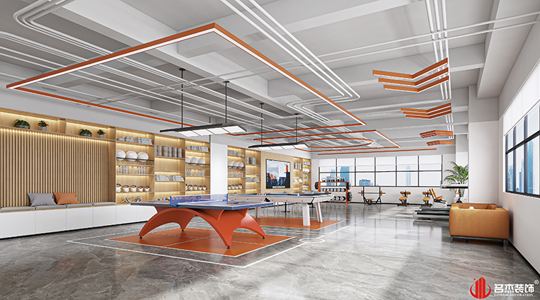 這次的主打風(fēng)格是時(shí)尚簡(jiǎn)約風(fēng)格,前臺(tái)背景墻區(qū)域采用漸變的方式,以及在天花上面使用不銹鋼水波紋蜂窩板來(lái)為這個(gè)空間增添不少設(shè)計(jì)感。而在健身區(qū)使用橙色作為空間的點(diǎn)綴色,暖黃色作為背景墻,和橙色形成一種呼應(yīng)。#廣州辦公室裝修設(shè)計(jì)#